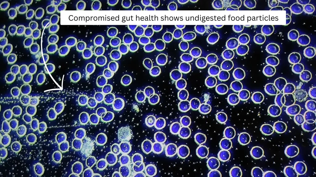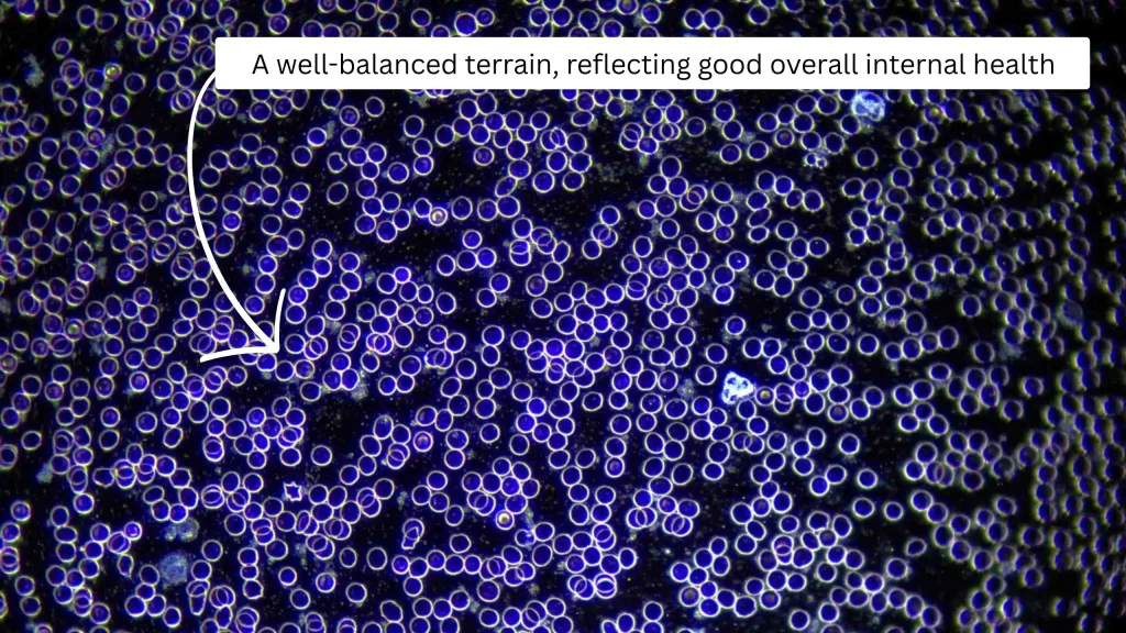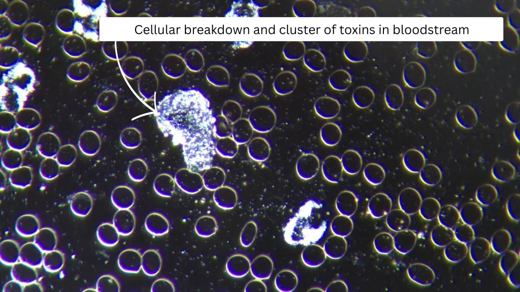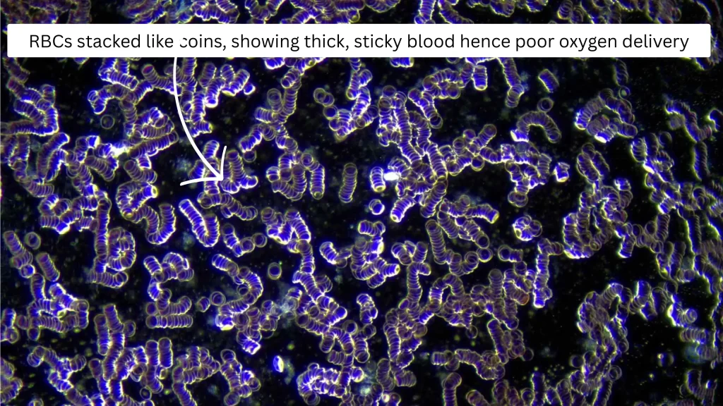 The practitioner will observe the blood in its live state, noting the shape and size of red blood cells, white blood cells, platelets, and any other visible particles